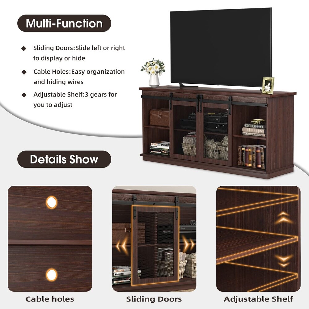 [Sufficient Storage Space] This TV stand console comes with 2 cabinets of storage space and 2 open spaces in the barn doors on both sides with 3 levels of adjustable and removable shelves, providing abundant storage or display space for CDs, DVDs, game boxes, decorative items and more. The spacious tabletop supports 40, 43, 50, 55, 60, and 65 inch TV.